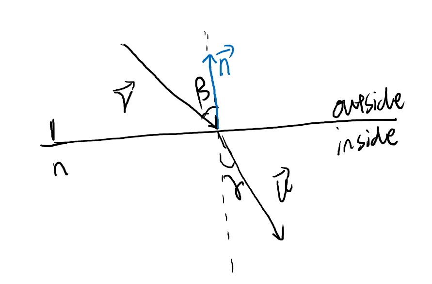 我们需要一个折射函数, 入参为入射光线方向向量 和法线向量 , 以及材质的折射率.