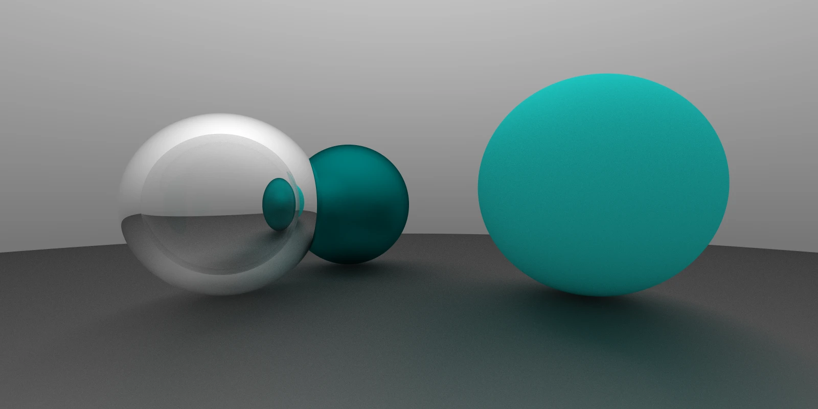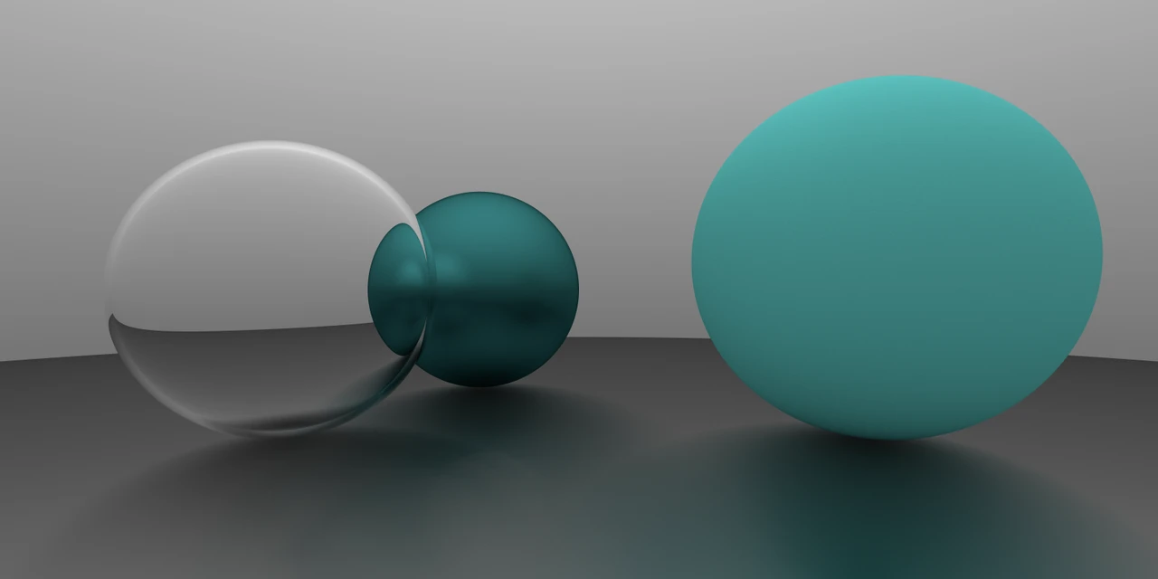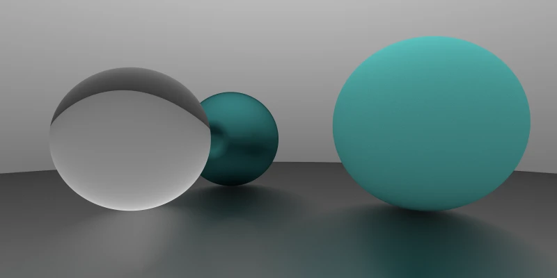 }效果如下, 注意透明球的右侧的绿色反光. (后来发现这里有错误, 这两张图是在后面更新摄像机实现后重新渲染的, 因此视角与前面稍有不一致)