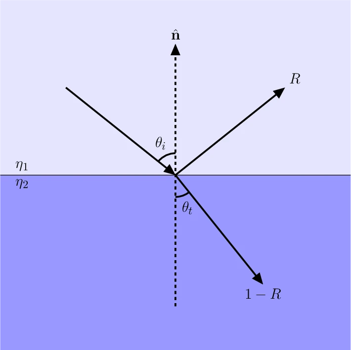 实际上, 即使不发生全反射, 仍然会有部分光线发生反射. 菲涅尔方程描述了此时折射强度与反射强度的关系. 如下图所示, 反射比为 , 折射比为 ,